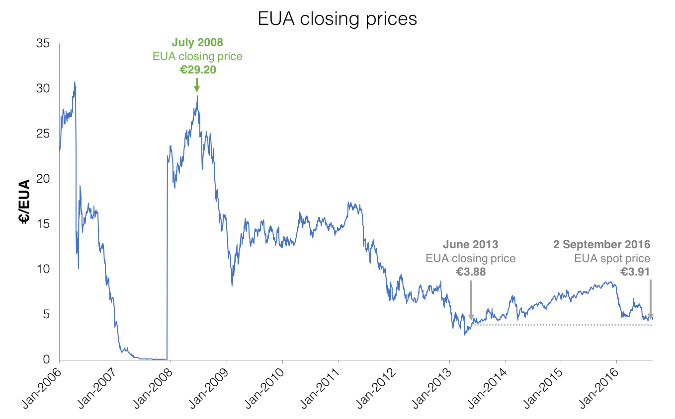 2 The last time the closing price for an EUA was this low was back in June 2013, when the price reached €3.88. https://twitter.com/TRPC_Climate/status/771645287643254784.