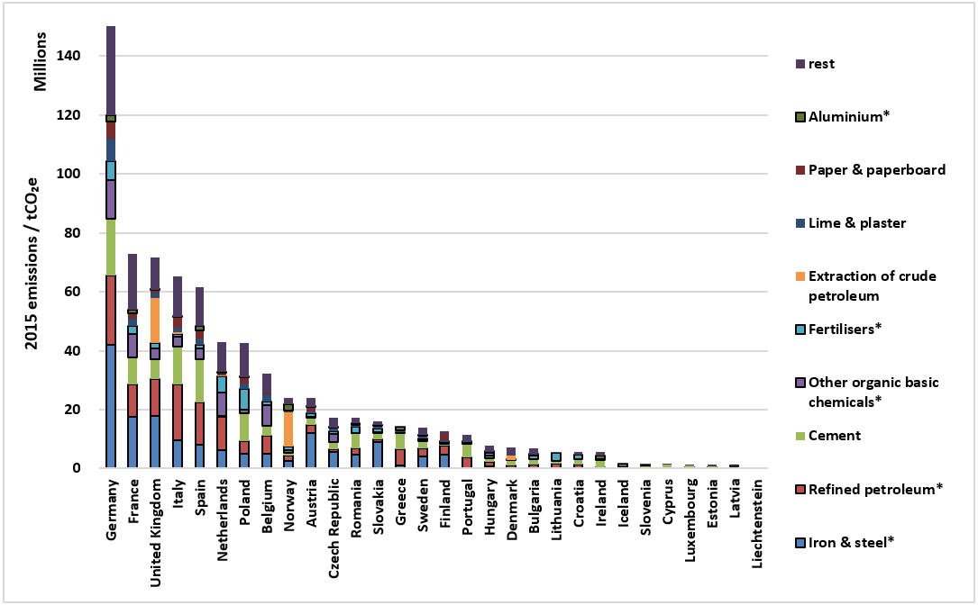 Chart 3. Split of the top emitting industrial sectors across Member States; sectors proposed to be exempted from any CSCF are outlined and marked with an *; emissions data from EUTL; mapping of installations to NACE codes as provided by the Commission for 2015-2019 carbon leakage list complemented by in-house desk research