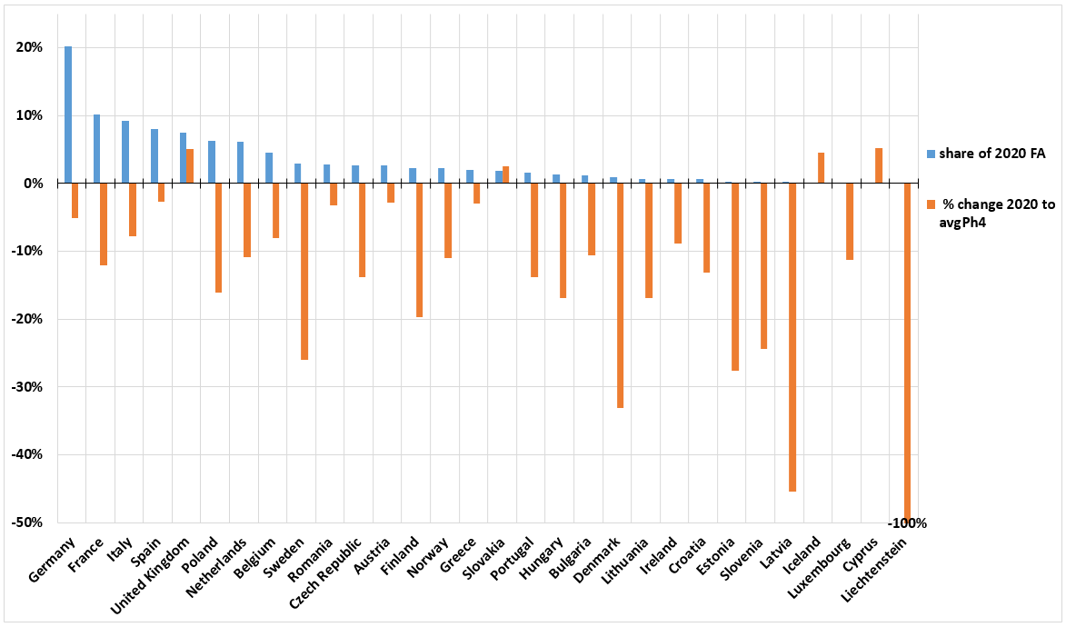 Chart 4. Comparing how Member States share of the industrial free allocation will change from 2020 to avg across Ph4; 2020 data from EUTL; post-2020 from Sandbag modelling (same assumptions as Charts 1 & 2)
