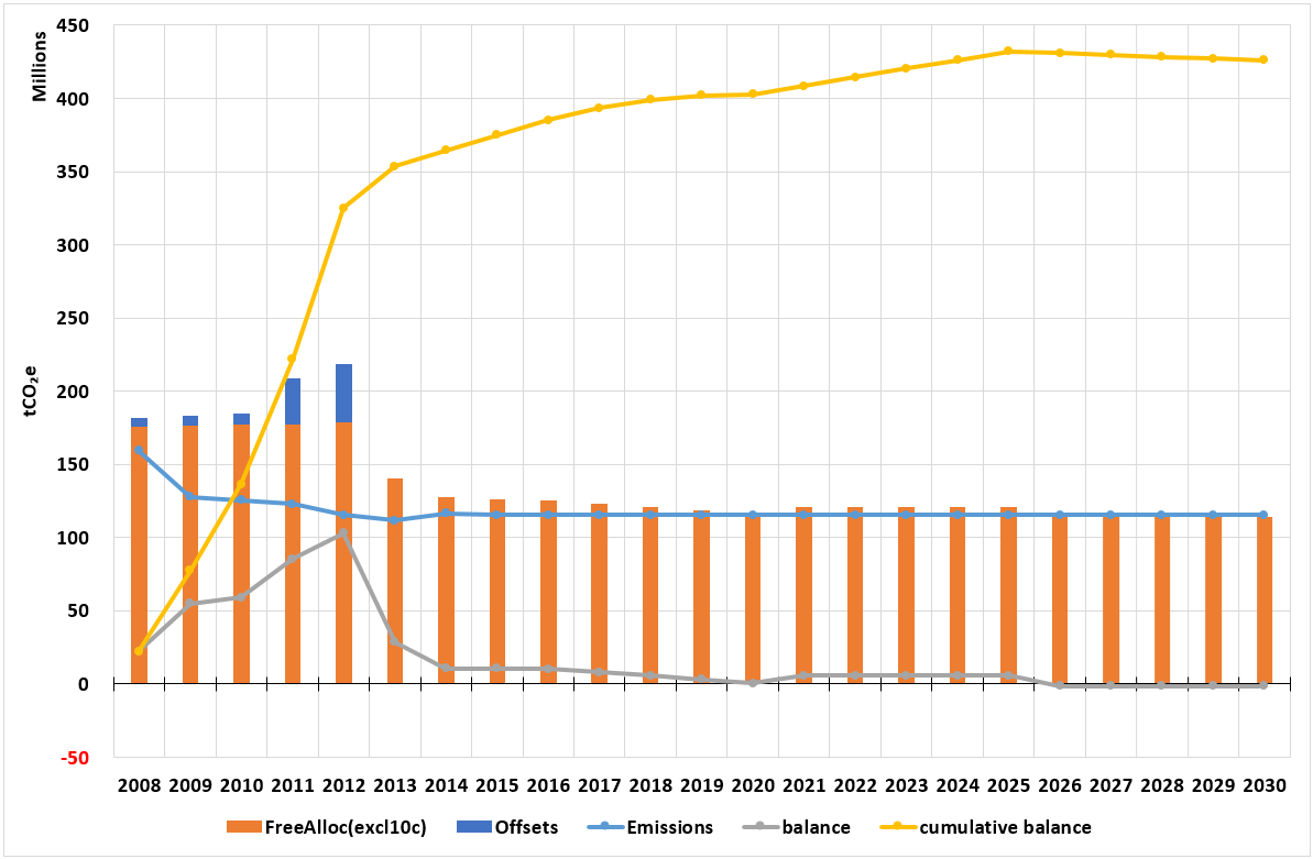 Chart 2. Trend in allowance supply balance[13] for NACE sector 23.51 Cement; 2008 to 2020 data from EUTL (with emissions held at 2015 levels); post-2020 from Sandbag modelling (LRF2.2% continued from 2020cap; NER from Ph4; 300 million innovation support from FA (rest from auctioning); binary CL at 100% & 0% but with 30% FA for district heating; 0% activity growth; 3% of cap set aside for indirect cost compensation (1/3 from FA, 2/3 from auction); BM red -0.3% for Iron and steel & refined petroleum, -1.5% for Paper and paperboard & Fertilisers, -1% rest; auction share red to 54% to avoid a CSCF)