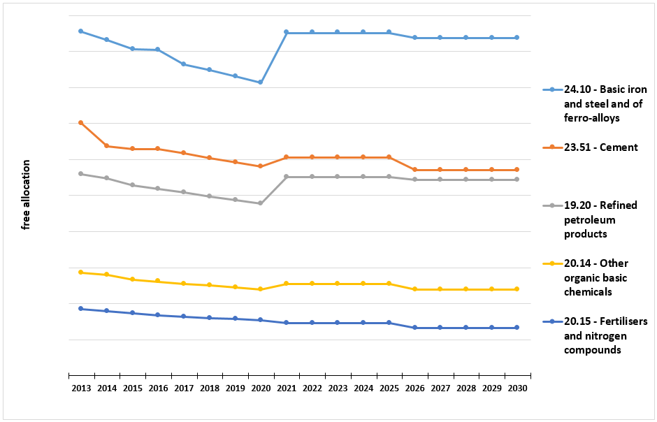 Chart 1. Trend in free allocation for the top 5 emitting NACE sectors; 2013-2020 from EUTL; post-2020 from Sandbag modelling (LRF2.2% continued from 2020cap; NER from Ph4; 300 million innovation support from FA (rest from auctioning); binary CL at 100% & 0% but with 30% FA for district heating; 0% activity growth; 3% of cap set aside for indirect cost compensation (1/3 from FA, 2/3 from auction); BM red -0.3% for Iron and steel & refined petroleum, -1.5% for Paper and paperboard & Fertilisers, -1% rest; auction share red to 54% to avoid a CSCF)
