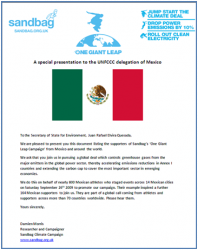 At the Copenhagen conference itself, Sandbag pooled its One Giant Leap signatories with petitions from other climate NGOs from around the world gathered under the TckTckTck coalition. Together we presented UNFCCC Executive Secretary Yvo de Boer and Conference President Connie Hedegaard with over 10 million petitions calling for a Fair, Ambitious and Binding deal. Anticipating such a deal might not be reached in Copenhagen, Sandbag arranged a separate handover of our campaign petitions to Environment Minister of Mexico, Juan Rafael Elvira. Mexico will preside over the annual Climate Conference when it convenes in November 2010 and our campaign will hopefully be front of mind as they prepare for their new role.