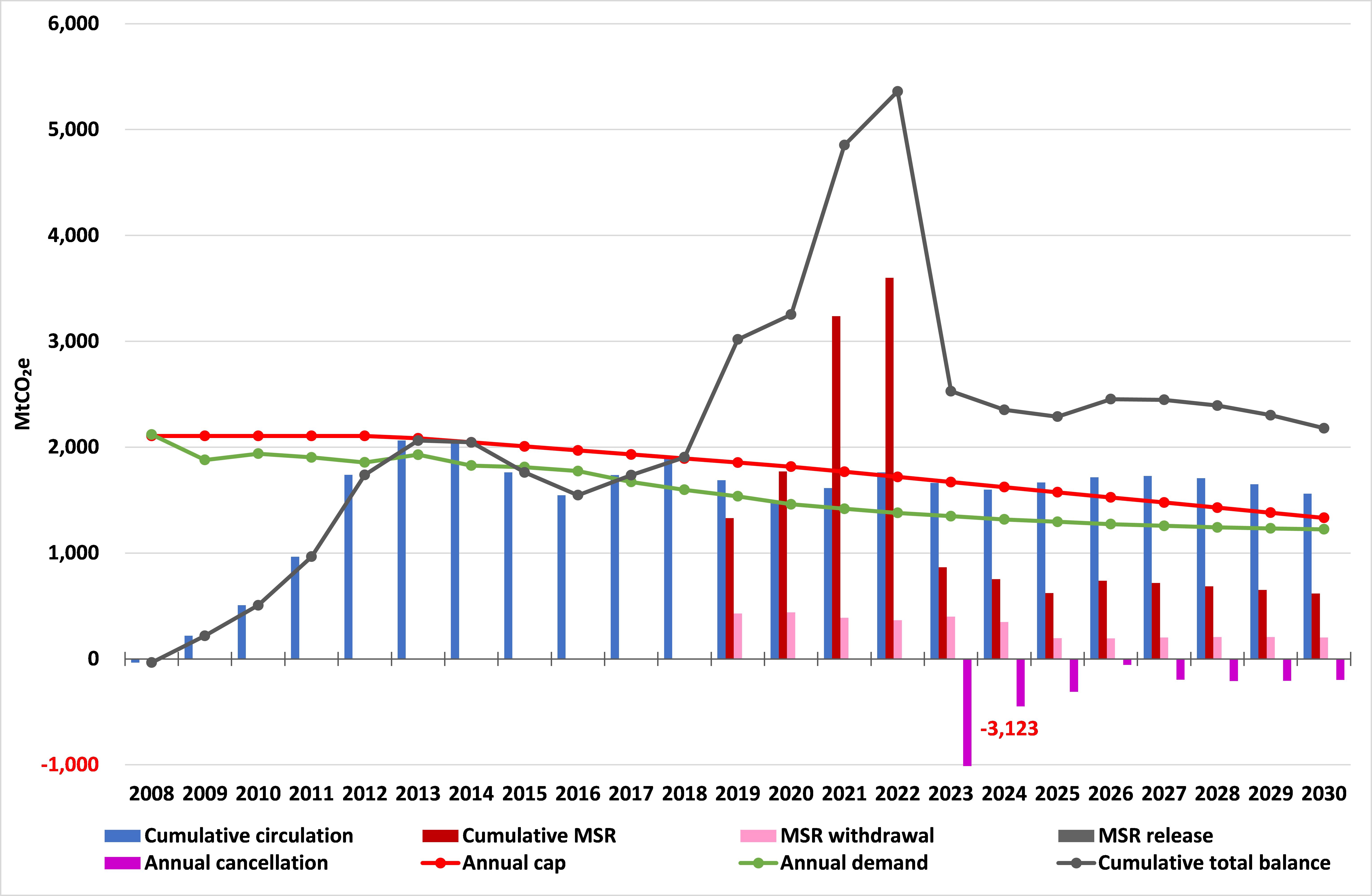 Reforms leave the ETS with a continuing enormous surplus (blue bars)